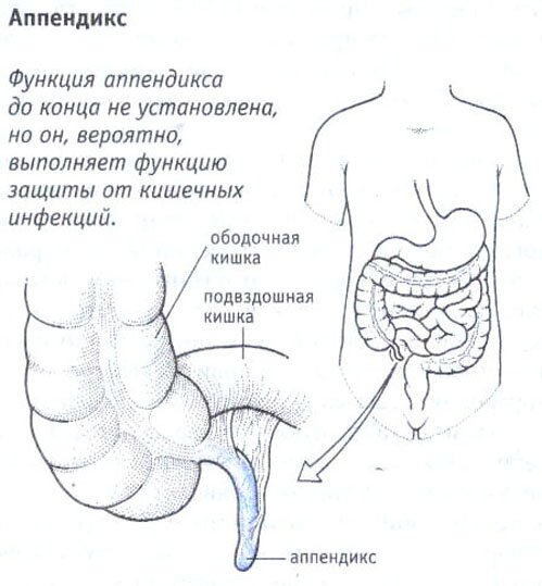 Считается, что аппендикс, размер которого приблизительно равняется мизинцу человека,— это рудиментарный орган (червеобразный отросток, присутствие которого в организме считается необязательным). Фактически, это скопление лимфатической ткани. Он, вероятно, играет незначительную роль в защитном механизме кишечника. При определенных обстоятельствах аппендикс может воспалиться, т. е. развивается аппендицит.