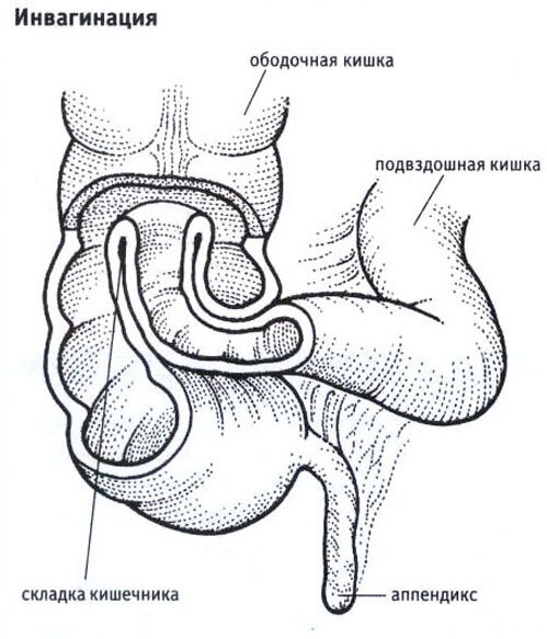 По какой-то причине часть кишечника втягивается в другую часть наподобие телескопа, вследствие чего нарушается кровообращение в ущемленной части кишечника.