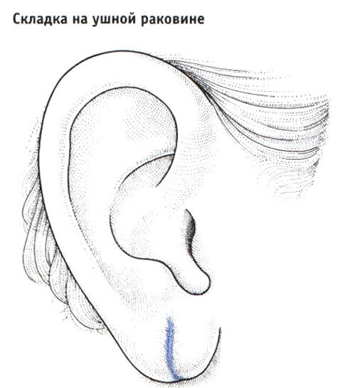 Постановка диагноза по мочке уха является, наверное, самым легким методом диагностики атеросклероза. Многие исследования подтвердили, что складка на мочке уха появляется при развитии атеросклеротического процесса в сосудах. Чем глубже такая складка, тем тяжелее атеросклероз. Складка образуется вследствие закупорки артерий уха. Любой человек, у которого появилась такая складка, должен предпринять профилактические действия, чтобы попытаться предотвратить почти неизбежное развитие атеросклероза.