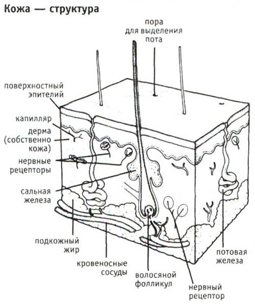 Кожа — это многофункциональный орган, основная функция которого — защищать ткани и внутренние органы. Посредством кожи человек получает информацию осязательного плана. Благодаря водоотталкивающим и изолирующим свойствам кожи осуществляется защита организма от внешних факторов воздействия окружающей среды и поддерживается внутренняя температура организма. В коже имеется два вида желез: потовые (смотри раздел Потоотделение) и сальные (смотри раздел Сальные железы).