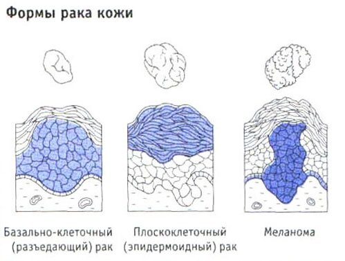 Базально-клеточный, или разъедающий, рак развивается в базальном, то есть самом нижнем, слое кожи. При этой форме раковые клетки растут медленно и не распространяются. Разъедающий рак проявляется в появлении шероховатого или как бы покрытого чешуйками бугорка, или же в виде небольшой язвочки. Эти бугры или язвы обычно образуются на границе кожи и слизистой оболочки в уголках глаз или рта. Такие бугорки телесного цвета не причиняют боли. Как правило, их замечают и начинают лечить до того, как эти образования достигнут 1 см в диаметре.
